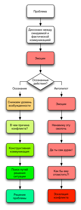 В недавней заметке „Глухая оборона“ я советовал прочитать интересную статью Марка Галстона (Mark Goulston) „Don’t Get Defensive: Communication Tips for the Vigilant“, по поводу того, как продуктивно реагировать на критику (обоснованную или необоснованную), не давая волю возникающим эмоциям. Основной тезис статьи: обороняясь, мы интуитивно желаем нанести три удара: защита («это не я»), возмездие («сам ты дурак»), поиск решения («что делать»); наиболее продуктивно же — это не наносить первые два удара, а всё внимание уделить третьему, то есть приложить усилия к разрешению конфликтной ситуации. Правда, не совсем понятно, каким образом уловить момент возникновения негативной эмоции, ведь, согласитесь, разум отключается, когда вас, к примеру, оскорбили или незаслуженно обидели, и единственная всепоглощающая мысль — это отомстить обидчику! Как же вовремя спохватиться, остановить разрушительное действие эмоций?
